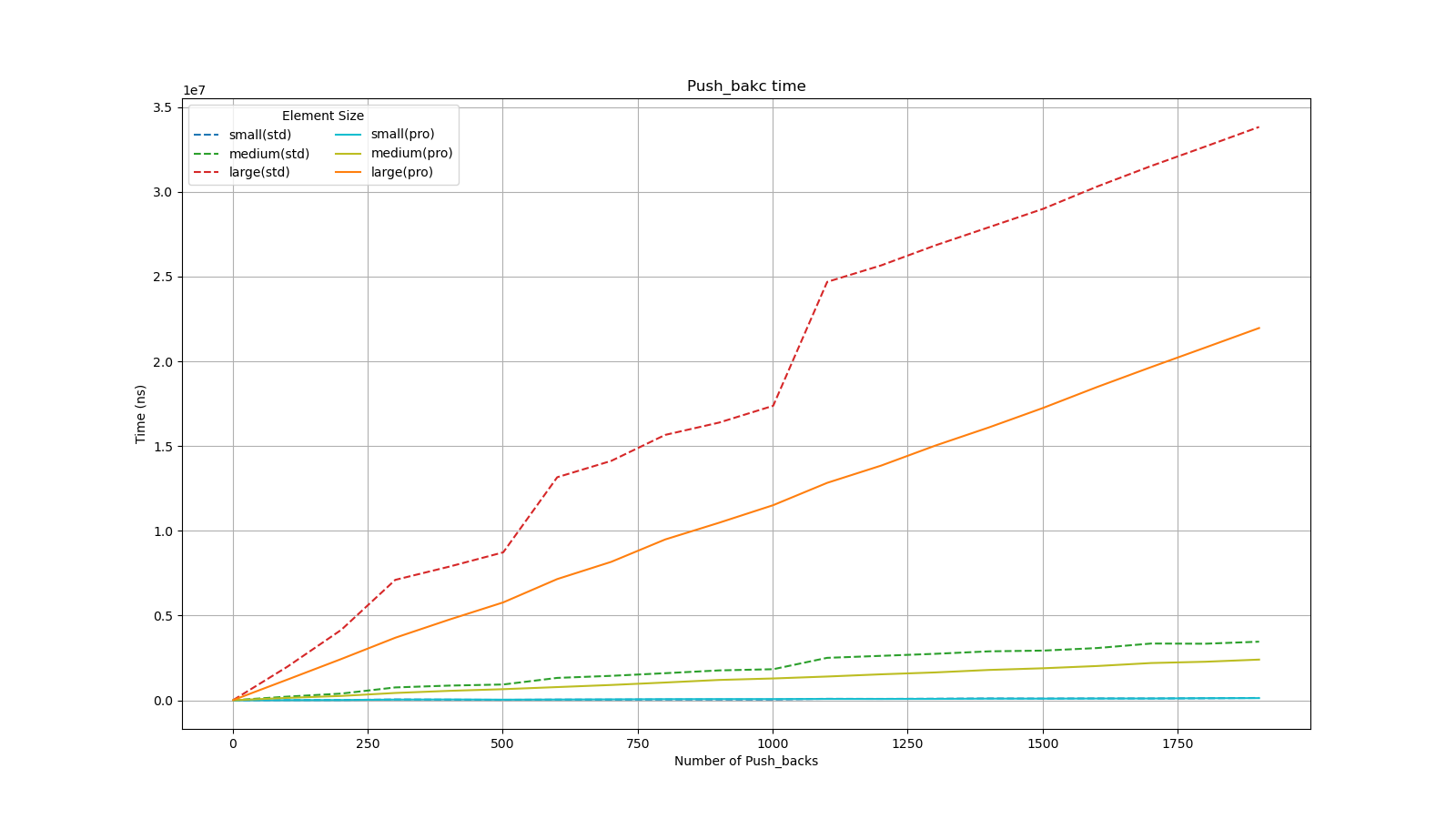 The test compared the push_back operation times of vector_pro and std::vector with the same initial list length, under different element sizes and quantities.