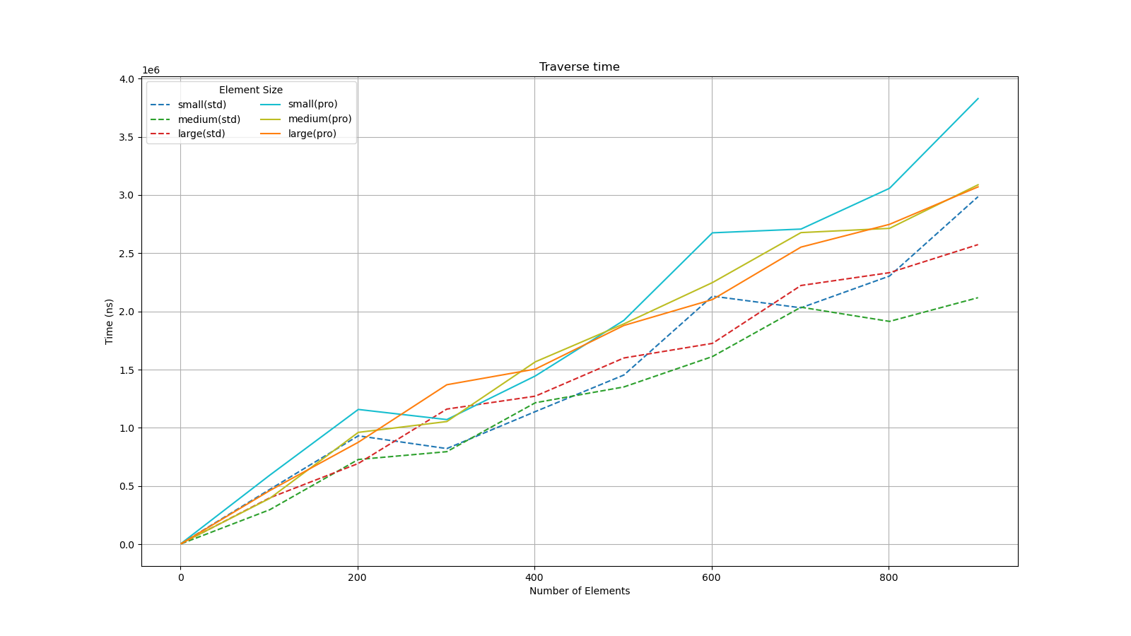 We compared the time consumption of traversing the container in vector_pro and std::vector with different element sizes and quantities.